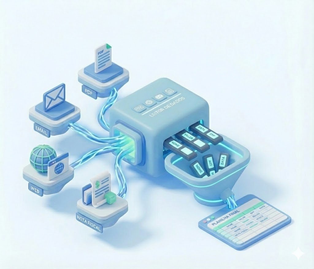 Nossas automações “leem” e-mails, sites e PDFs. Logo após, elas extraem as informações que você precisa. Consequentemente, transformam dados brutos em planilhas prontas para análise, economizando horas de trabalho manual.
